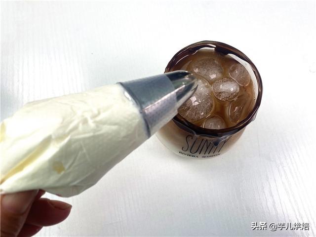 9.淡奶油加入细砂糖打发,装入裱花袋,挤到咖啡杯表面一周,再滴入适量巧克力酱。