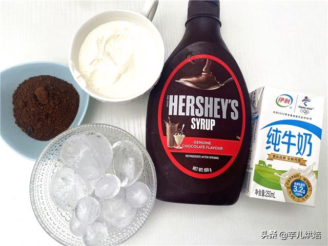 食材;咖啡粉 3勺,巧克力酱 适量,冰块 适量,纯净水 适量,淡奶油 150克,细砂糖 15克,牛奶 一盒。
