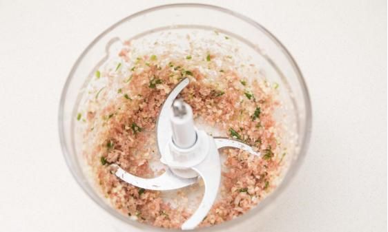 步骤三、往绞成碎末状的培根肉末加融化好的黄油,挤入适量的现磨黑胡椒粉并加两克左右的食盐,配料全部均匀的混合在一起。