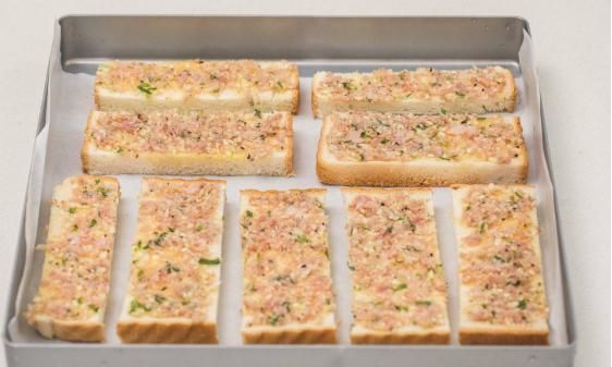 步骤六、这个时候烤箱也预热好了直接将烤盘送到中下层的为止,用上下火同时加热的模式继续烤制十分钟。通过透视窗观察到吐司片表面烤成金黄色即可关火,戴着隔热手套取出在室温下稍稍晾凉。