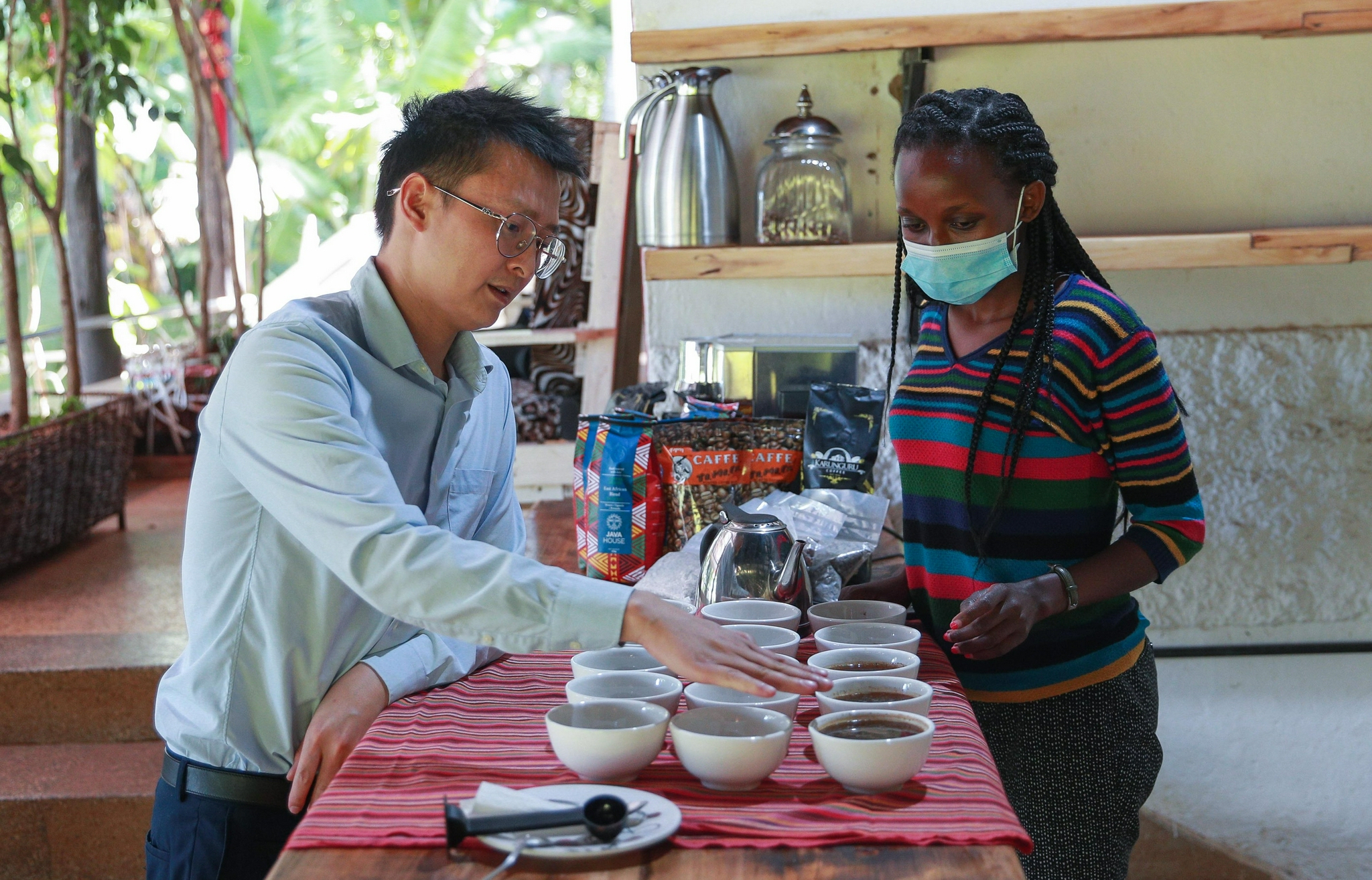 4月29日,张仁全(左)在肯尼亚内罗毕的餐厅里与员工讨论咖啡的品质。新华社记者 龙雷 摄