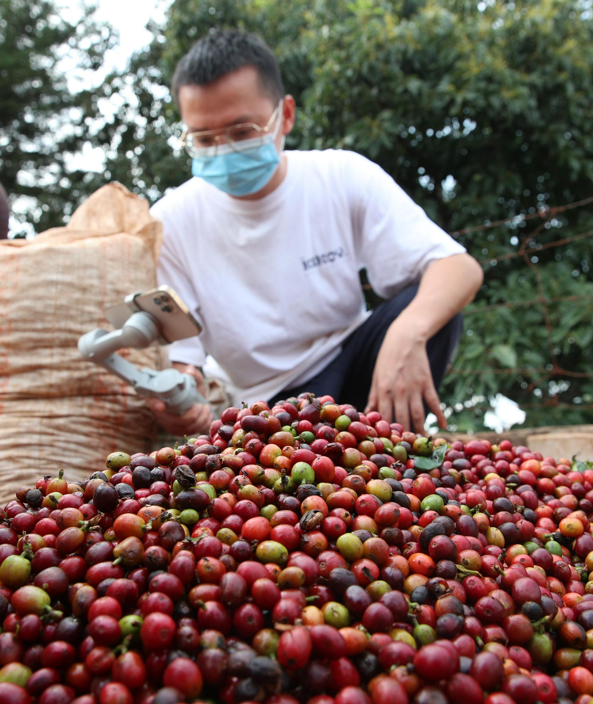 6月3日,张仁全在肯尼亚鲁依鲁的咖啡农场考察时拍摄短视频。新华社记者 龙雷 摄
