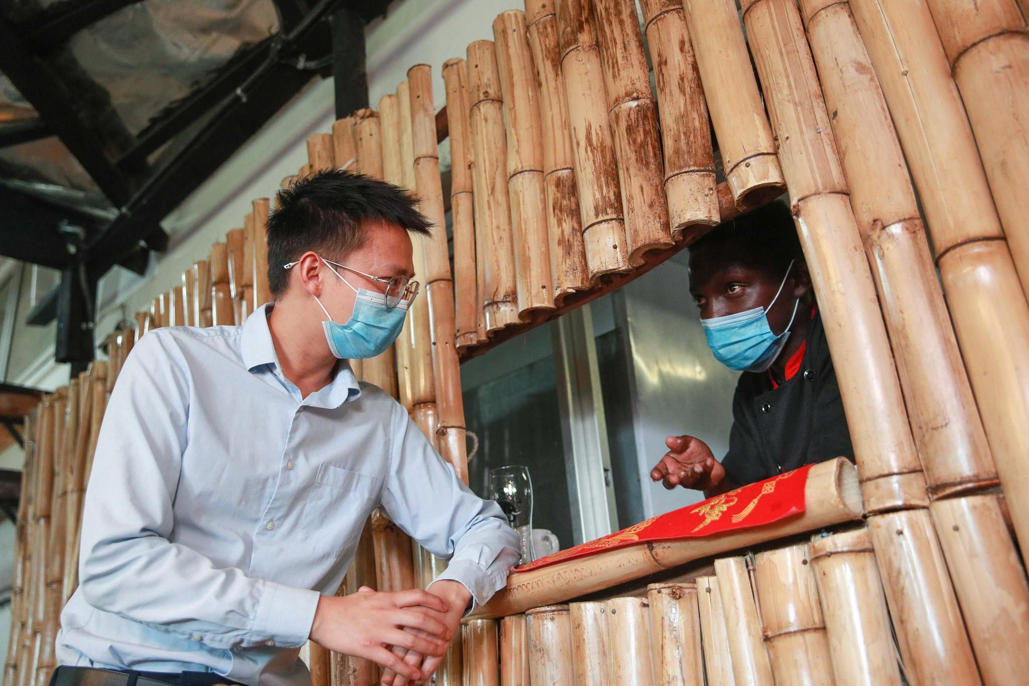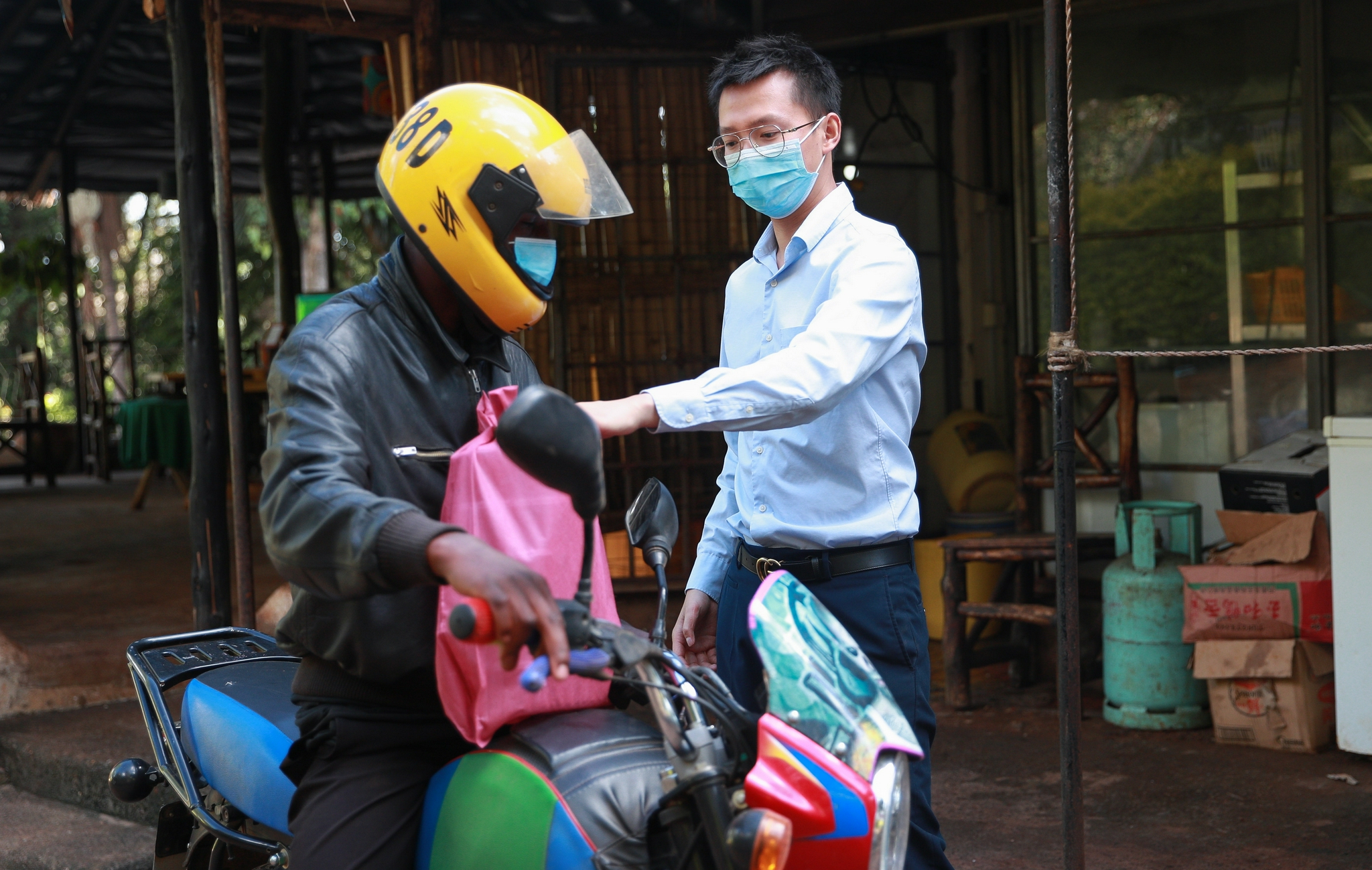 4月29日,在肯尼亚内罗毕,张仁全(右)将外卖的菜品交给送餐的骑手。新华社记者 龙雷 摄