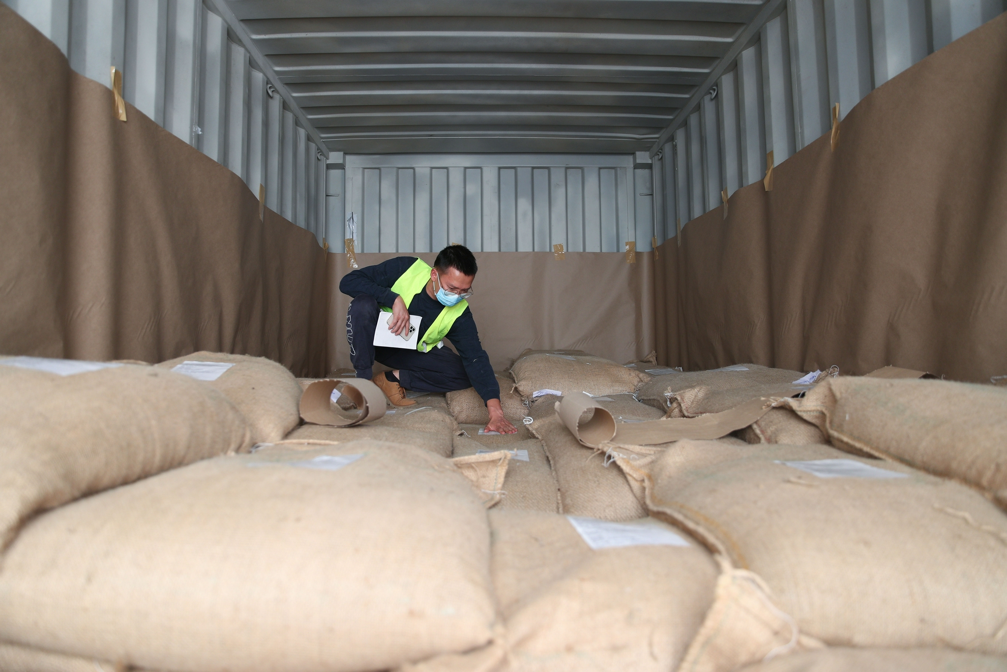 5月26日,在肯尼亚内罗毕,张仁全发货前为打包好的咖啡贴上标签。新华社记者 龙雷 摄