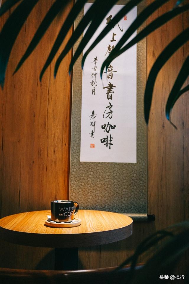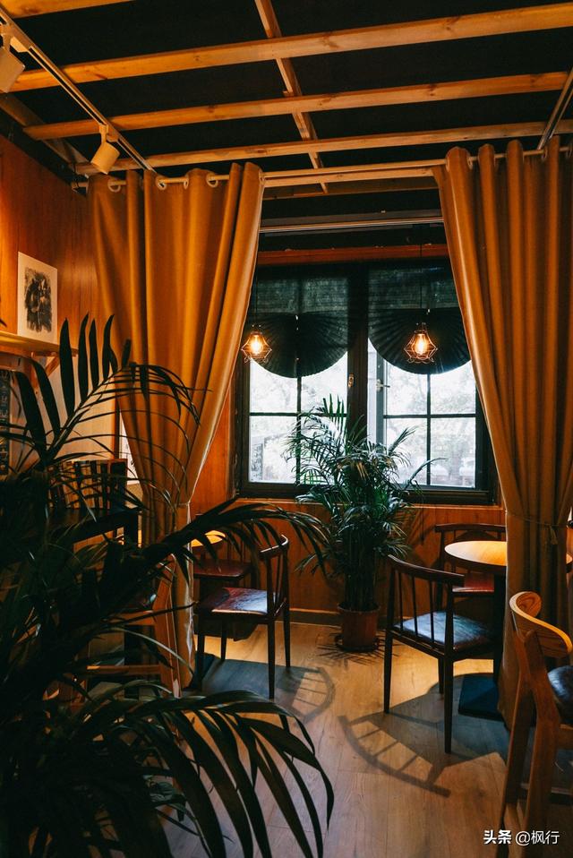 新开的书房咖啡,入口就是个简单的推拉门,进去后非常惊艳。用书架隔开了两组空间和Z行通道,规划出了几个安静的位置。最喜欢临街窗边的座位,木色墙壁,墨绿色百叶窗、咖啡色窗帘和大量的绿植,让看书喝咖啡的环境安静舒适。