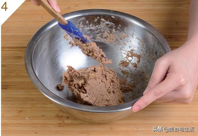 4.加入过筛的低筋面粉、核桃,用刮刀拌匀至看不见粉粒。