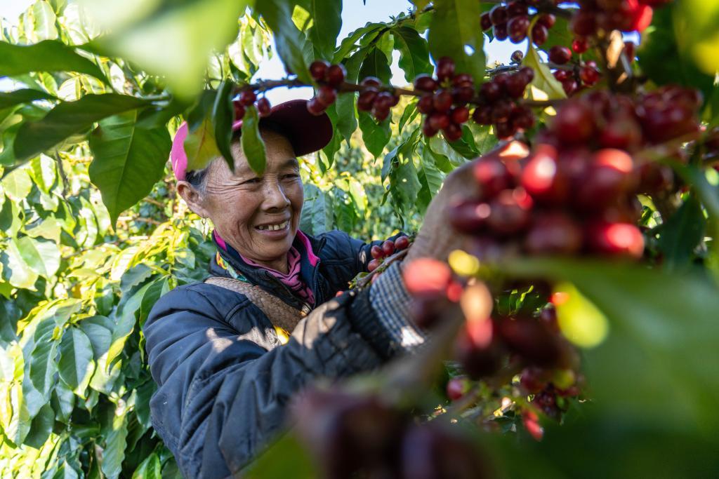 2026年1月23日,咖农在云南省临沧市双江县沙河乡陈家寨村云顶筑巢咖啡庄园采摘咖啡果。新华社记者高咏薇 摄