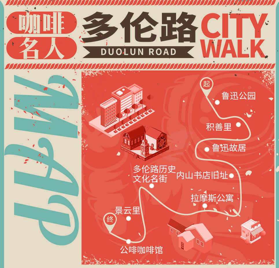 从鲁迅公园出发,经过山阴路,向多伦路而行,徜徉在梧桐树荫和老房子之间,逛逛曾在此生活的海派文人生活过的故居,累了喝杯咖啡,不知不觉中就能消磨掉一个悠闲的下午。鲁迅曾经在这一带度过他生命中的最后十年(1927年—1936年),景云里、多伦路、拉摩斯公寓、内山书店,乃至公啡咖啡馆,都曾经留下他的足迹。