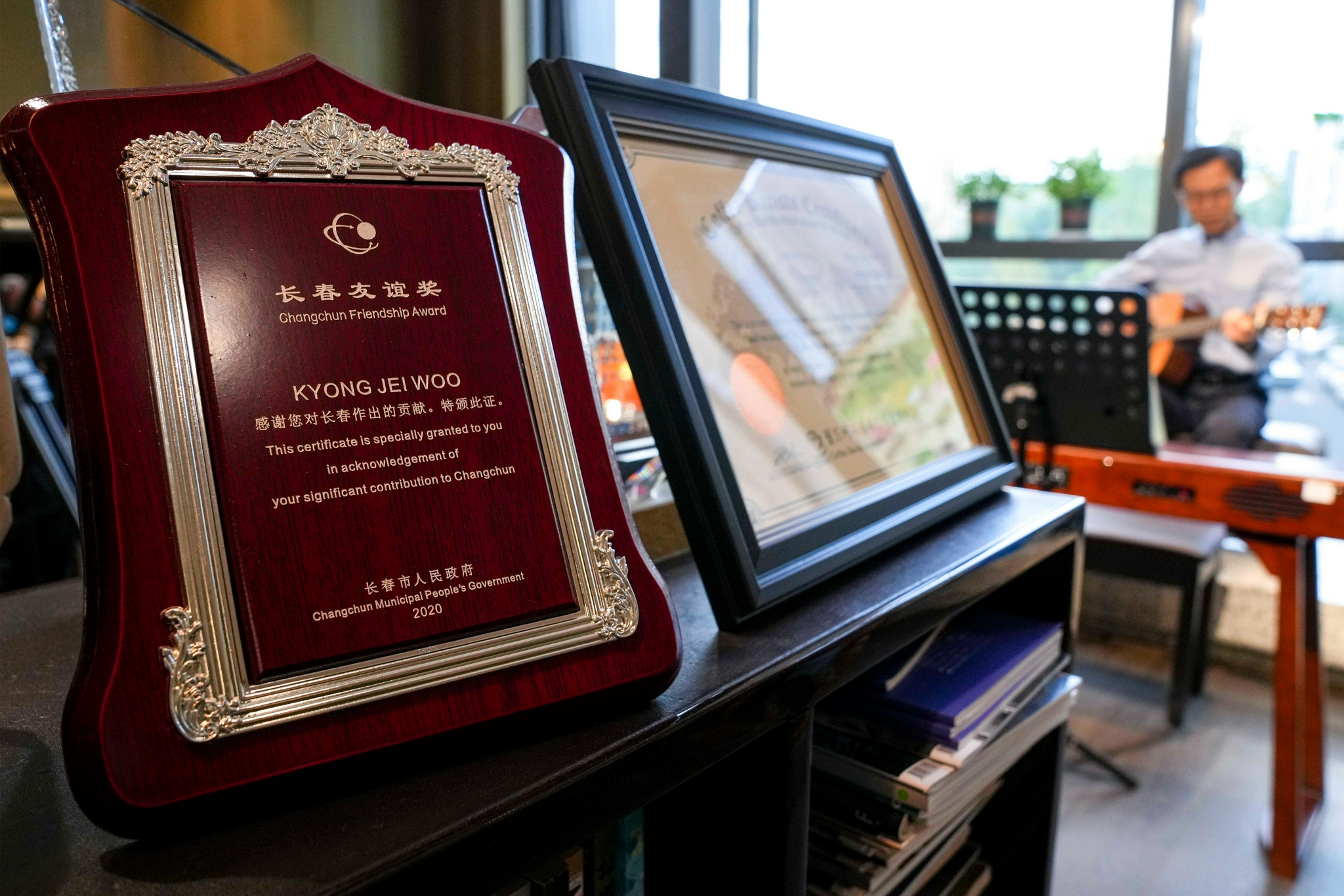 禹庆济在咖啡店内弹吉他,旁边摆放着长春市人民政府2020年颁发给他的“长春友谊奖”奖状(9月24日摄)。新华社记者 许畅 摄