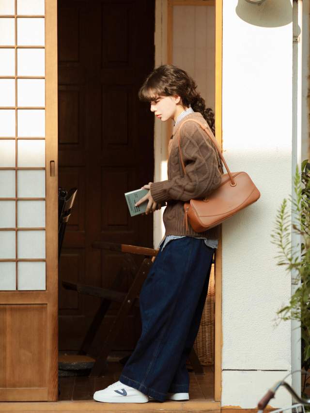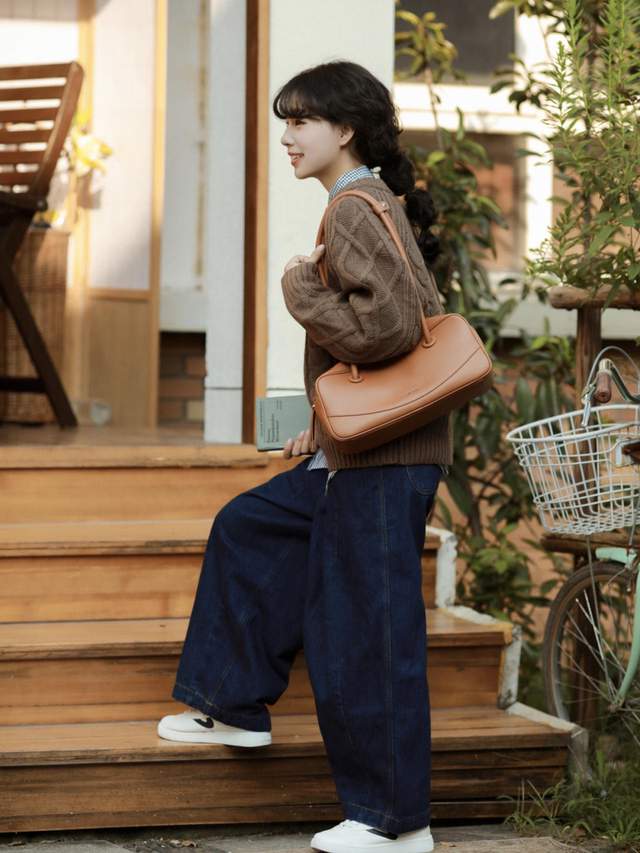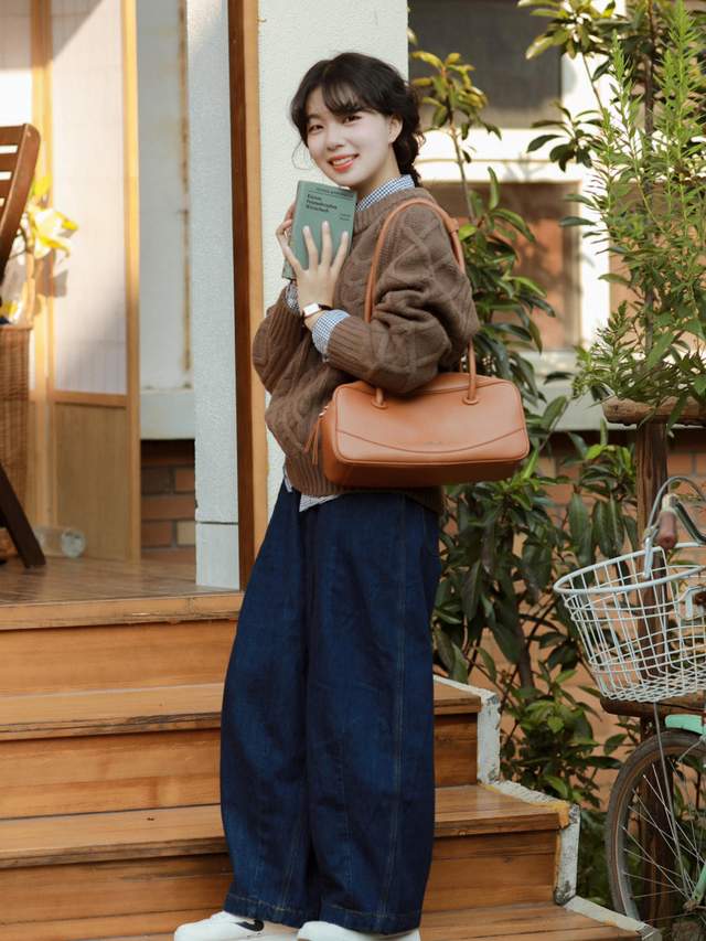 这一整套搭配起来的话给人一种慵懒休闲的感觉。日常出门的话,你可以选择一个皮质的卡其色托特包,这个包包容量是比较大的,背出去秋游很合适,而且还能够装下一些口红化妆品之类的东西,方便又实用。