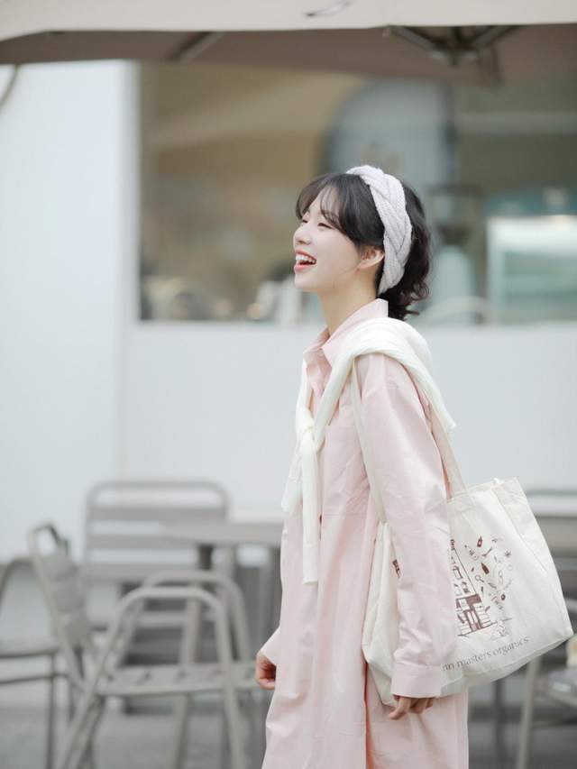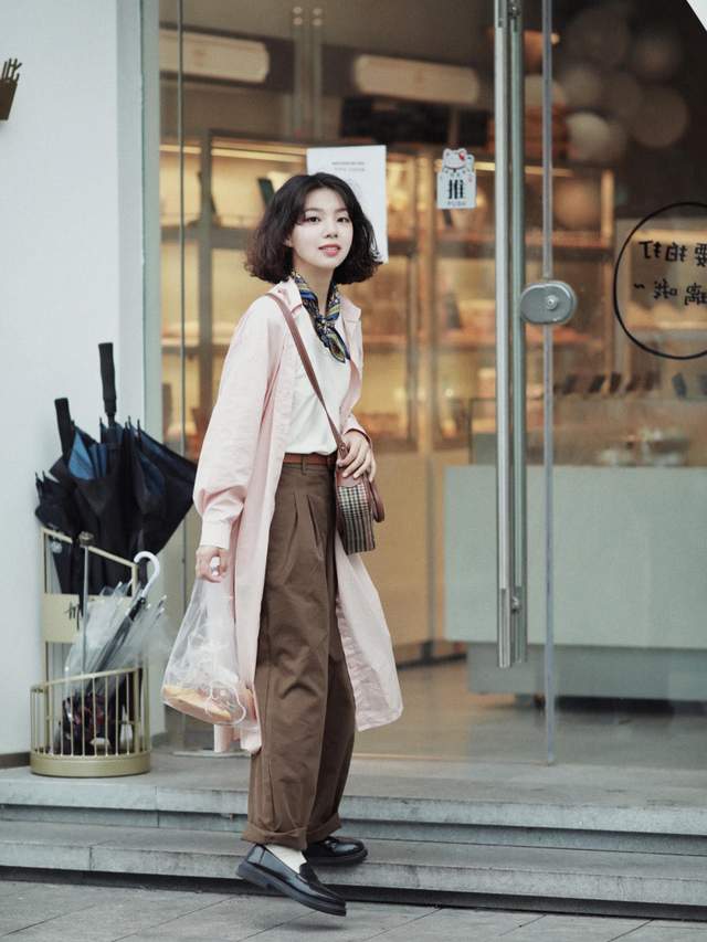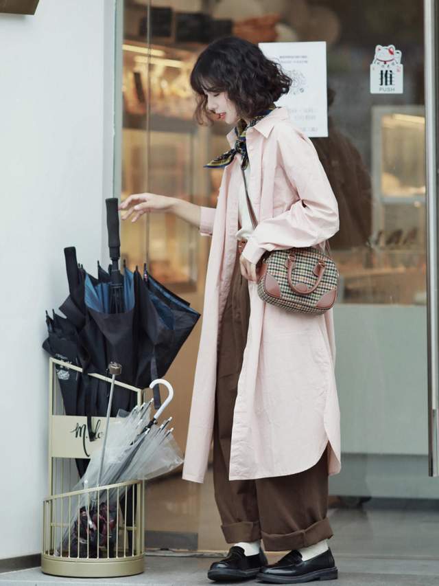 同样是秋天小个子的搭配,这位女生她上衣挑选了一件长款的衬衫裙。粉色的穿起来更加的显嫩,显得整个人气色特别好,翻领的设计穿起来有一种成熟又优雅的感觉。