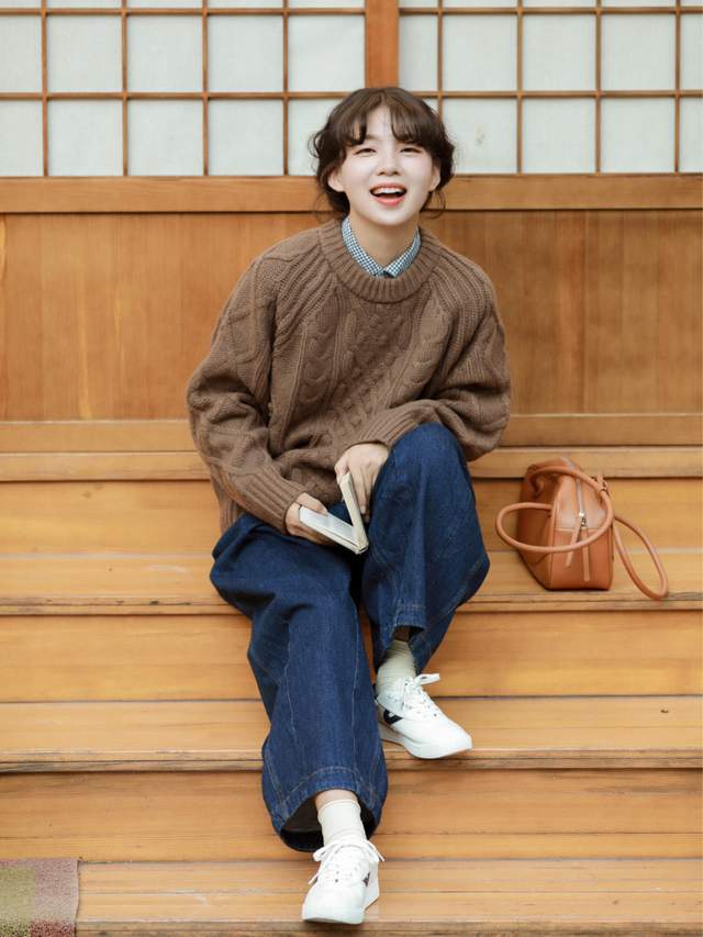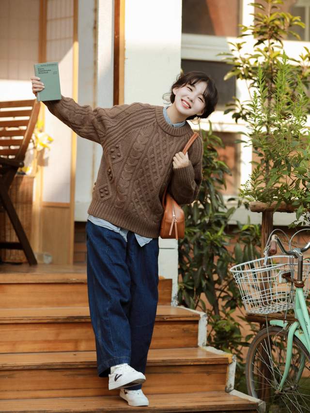 如果你不知道怎么搭配,那么你可以参考这位穿搭博主是怎样搭配的,小个子女生穿起来也很好看,她上衣挑选的是一件棕色的圆领毛衣,这款毛衣的面料是很柔软的,穿起来很舒服,而且整体的纹路还有一些图案,看起来很精致。