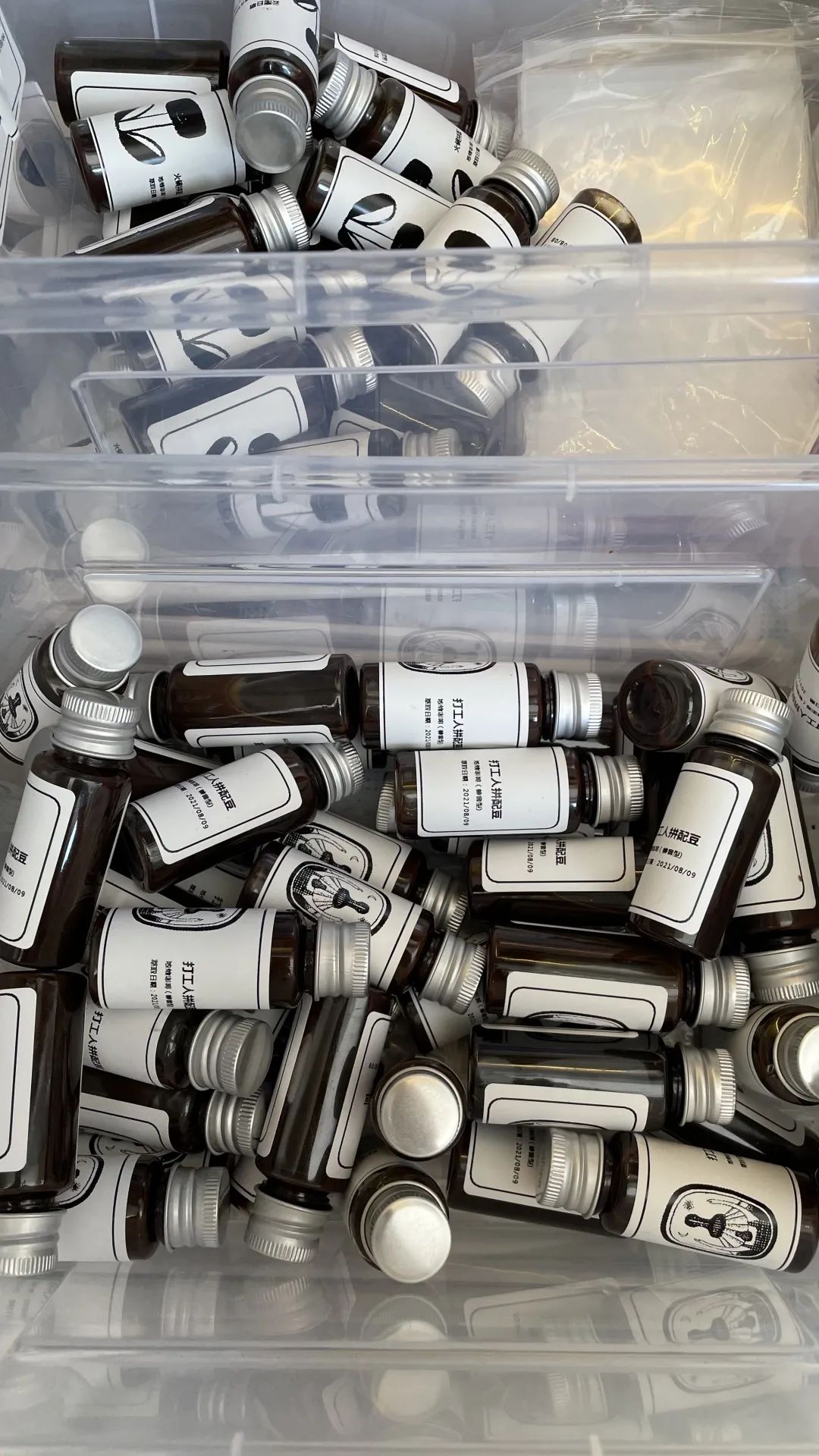 咖啡机基本没有歇过火,豆子在刀片间被磨碎的声音持续回响在磨豆仓和出粉口。一边是咖啡师在不断萃取,一边是店员熟练且稳定的折打包袋,以及为做好的咖啡封口,再包上保鲜膜和保温袋。