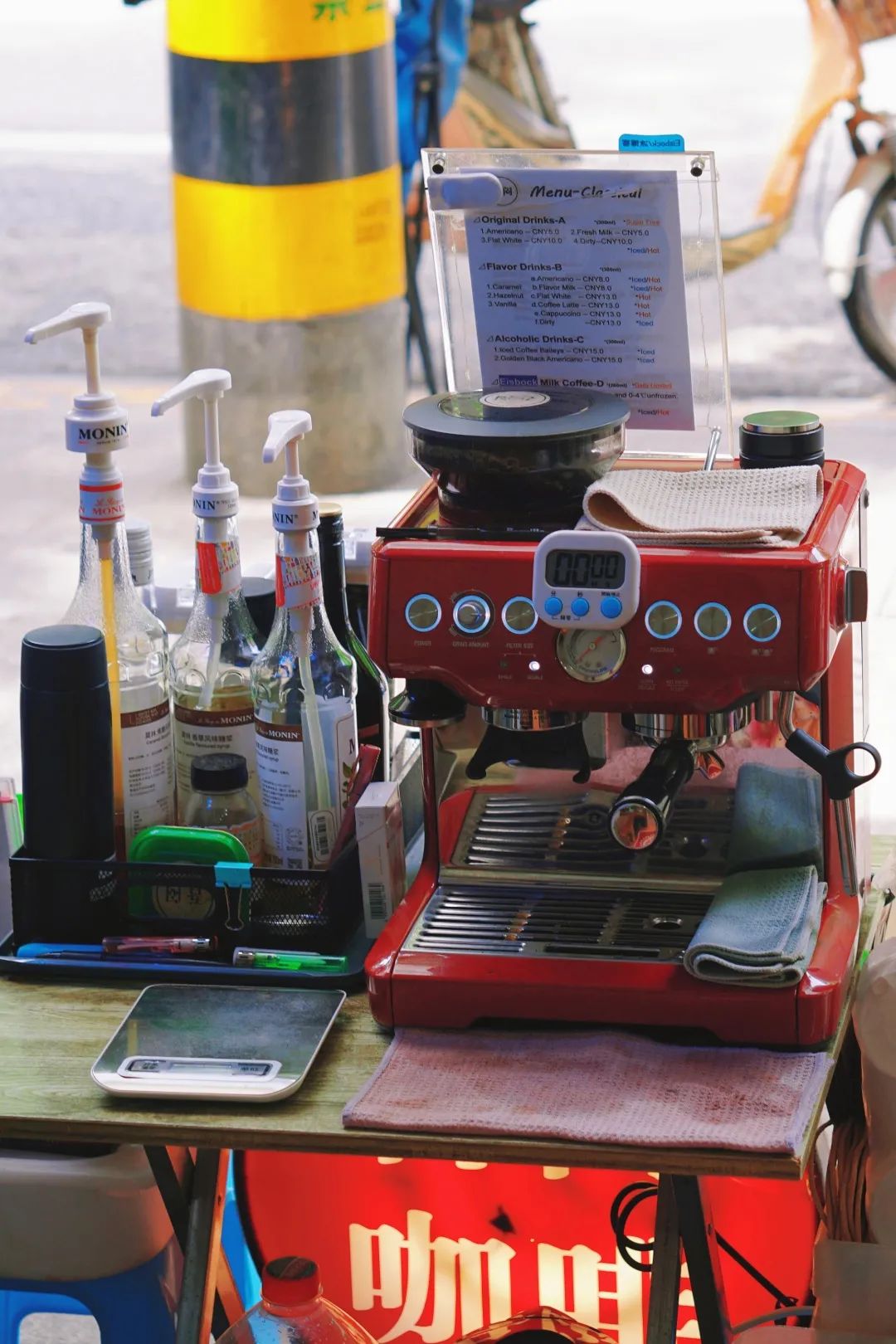 严记肥肠粉早上八点开门营业,吾闷咖啡也八点营业。清早,涌入周边写字楼的上班族,六医院上早班的医生护士,接送小孩上学的家长,时常来猴子的咖啡摊子上买一杯咖啡带走。有人加了微信,就提早五分钟让他做起,来了就提走,不耽误时间。也有开了车过来买的,有时遇上两辆车打挤,也就坐车上等个两三分钟。